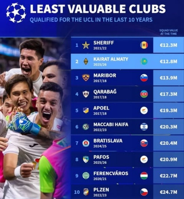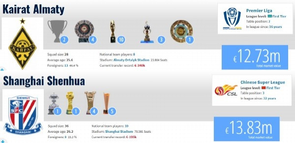 如果用德转身价来对比,甚至还能更直观。中超球队申花的德转身价是1383万欧元,打入欧冠正赛的阿拉木图凯拉特的德转身价是1273万欧元。