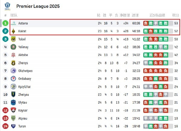 在哈萨克斯坦国内联赛,阿斯塔纳和阿拉木图凯拉特的竞争也是非常激烈。本赛季踢完24轮后(全年有26轮联赛),阿斯塔纳拿到53分领跑积分榜。阿拉木图凯拉特少赛一场拿到52分,如果可以赢下剩余的3场比赛,他们将会卫冕哈萨克斯坦国内联赛冠军。