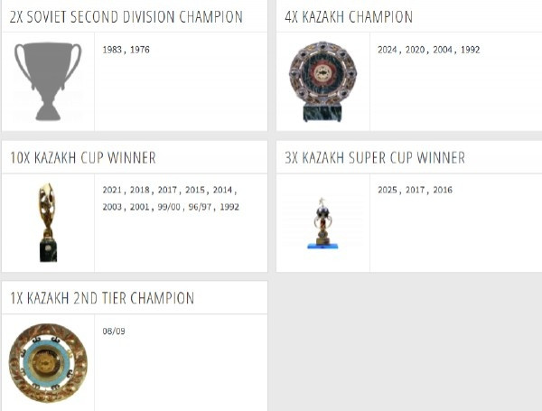阿拉木图凯拉特一共赢下过4次哈萨克斯坦超级联赛冠军,最近的一次是在2024年。他们不只是拿到了联赛冠军,还包揽了国内杯赛,成就双冠王。这也是1992年之后,球队再一次取得这样的成就。